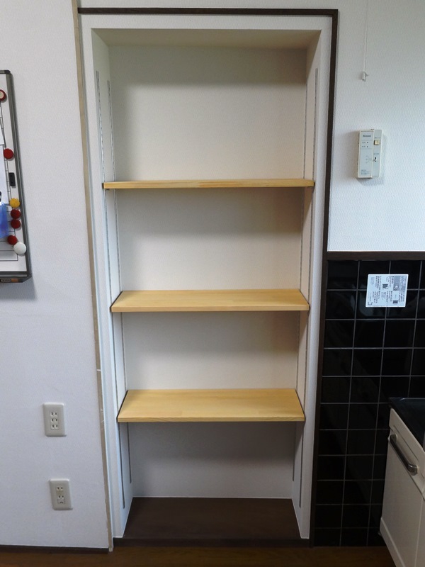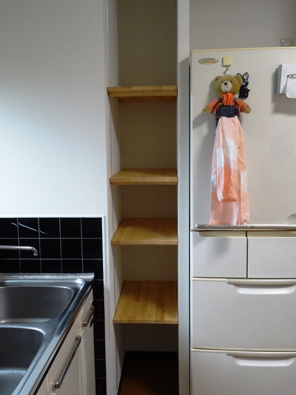 台所:ユニットバスを取り付けた時に出来た壁のスペース。今までベニアで蓋をしていた程度でしたが、今回内装をやり替え可動式の棚を取り付けました。