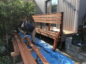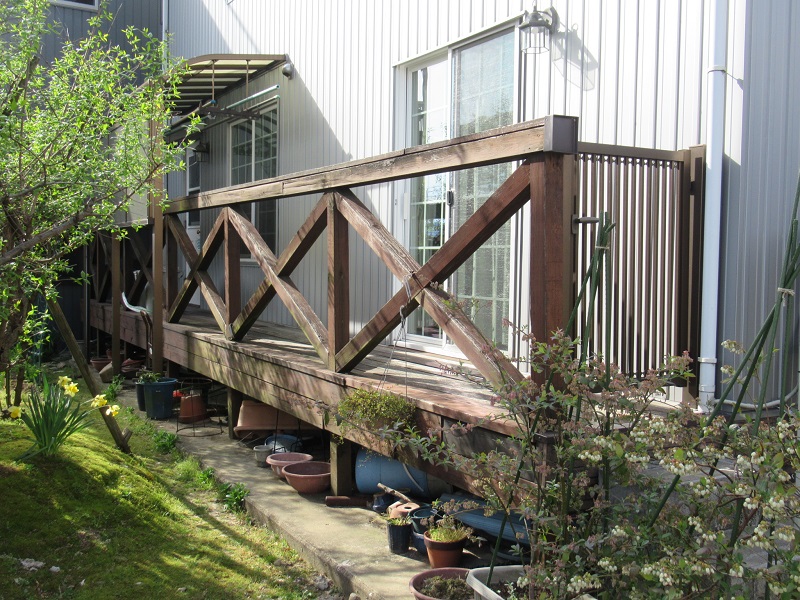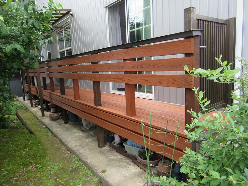 ウッドデッキが腐食してきたので修繕しました。土台や柱などは補強し再利用していますが、新品のウッドデッキによみがえりました。