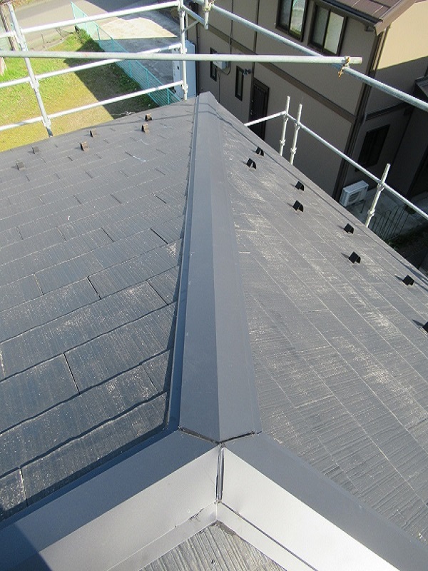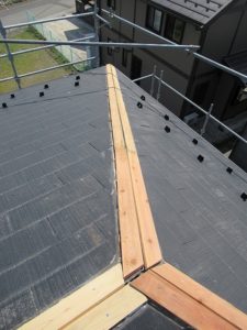 強風で屋根の笠木がメクレてしまいました。笠木の下地材が経年劣化にて弱っていたのが原因です。これを機に屋根全部の笠木の取替えをしました。