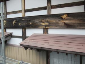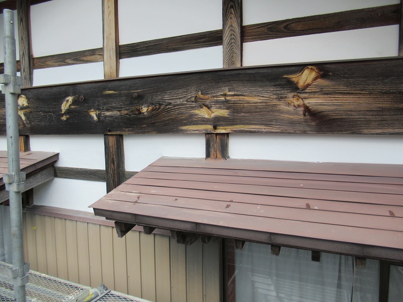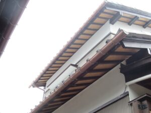 軒天の修繕工事。化粧軒天ベニアを上張りしました。